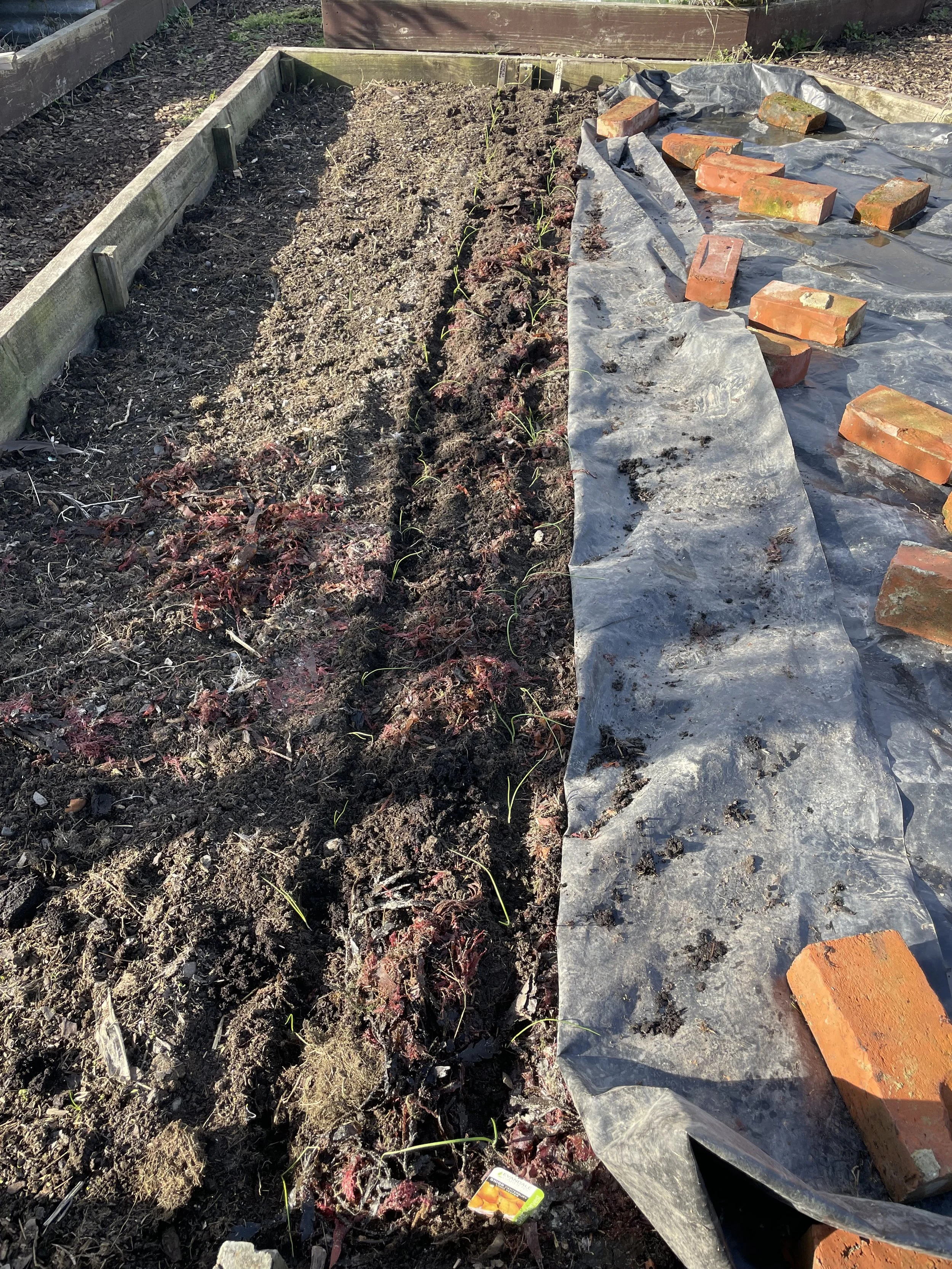 The root crop bed is bit of a bed of 2 halves. The garlic and onions, celery and leeks (if you have them here) love plenty of compost and feeding. But the tap root crops such as carrots and parsnips don’t like bulky lumpy soil, nor do they like too much fertilizer -especially nitrogen-based ones as that tends to make them grow lots of greenery rather than the bit we want them to grow – the bit underground. That is why we add well rotted compost in autumn and let that all break down over winter. Dig over this part of the bed now if its not too wet and start succession sowing of carrots, parsnips, and beetroot.